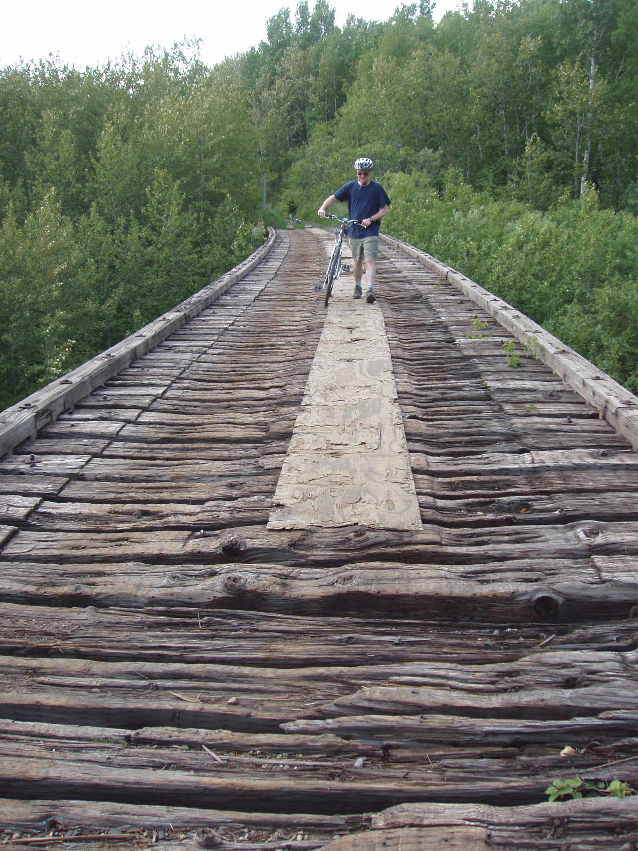 We then faced a seemingly insurmountable obstacle. An ancient trestle crossed a large gorge, which seemed to span the horizon. It looked worthy of the Hogwarts Express, and appeared to lead to Middle Earth itself. Following a long deliberation, we decided to walk the kids over the well-built structure hand-in-hand since plywood was laid down the middle by apparent bikers or well meaning dwarves.