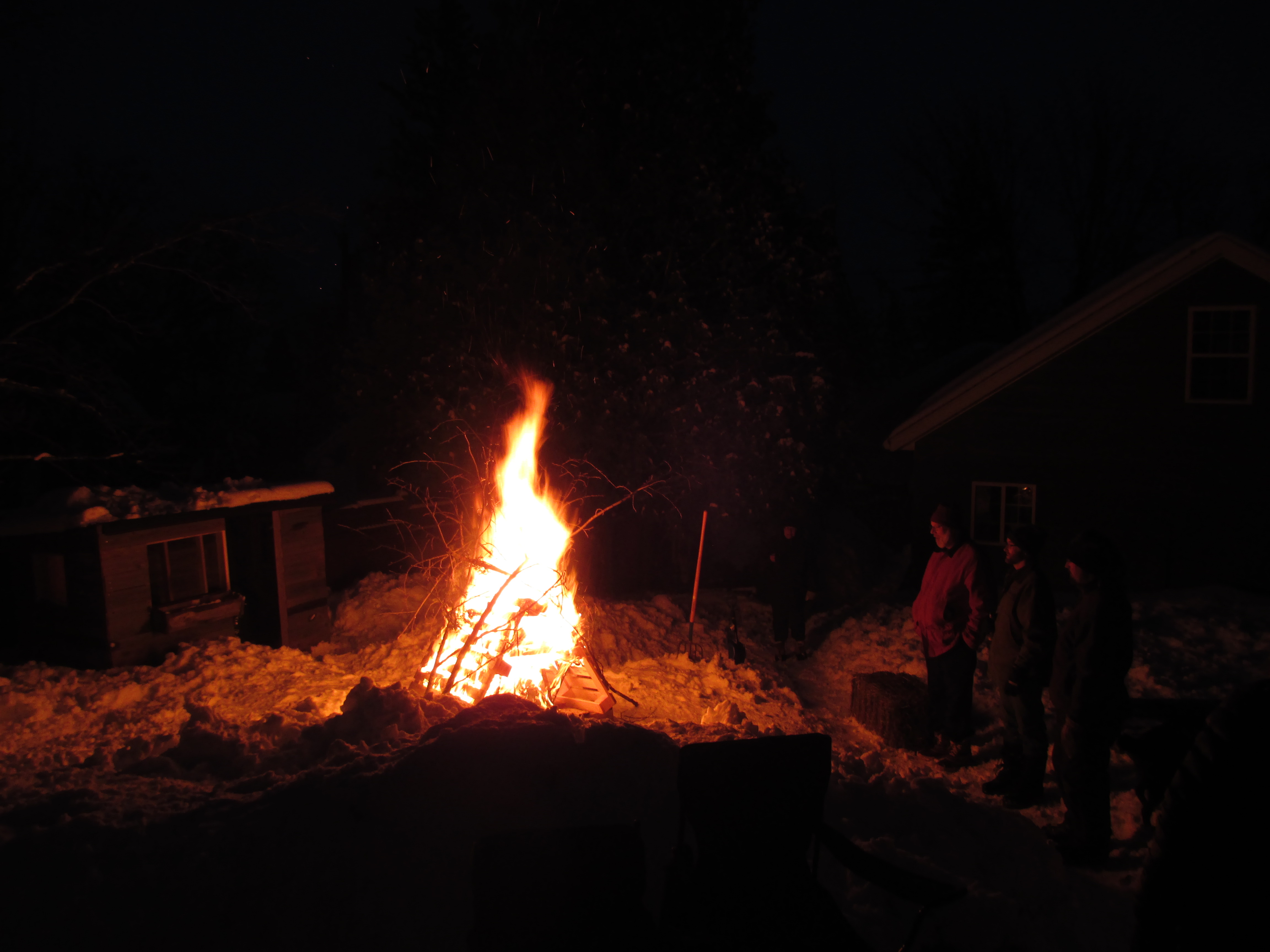 25 feet from the back door is plenty, and the effort and planning can be minimal. Last night, to celebrate the first full day of spring, we enjoyed our 2nd annual Stone’s Throw Party. It is an incredible opportunity to enjoy life together, even in adversity. This winter has been a long one for everyone, and old Jack Frost didn’t disappoint yesterday. It snowed 8 inches of wet and heavy snow throughout the day, and didn’t stop until shortly before the party. Thus I was forced to shovel and build the structure of our bonfire immediately prior to the festivities. I feared not being able to get it lit, so we used plenty of scrap cedar, which readily takes to fire…
