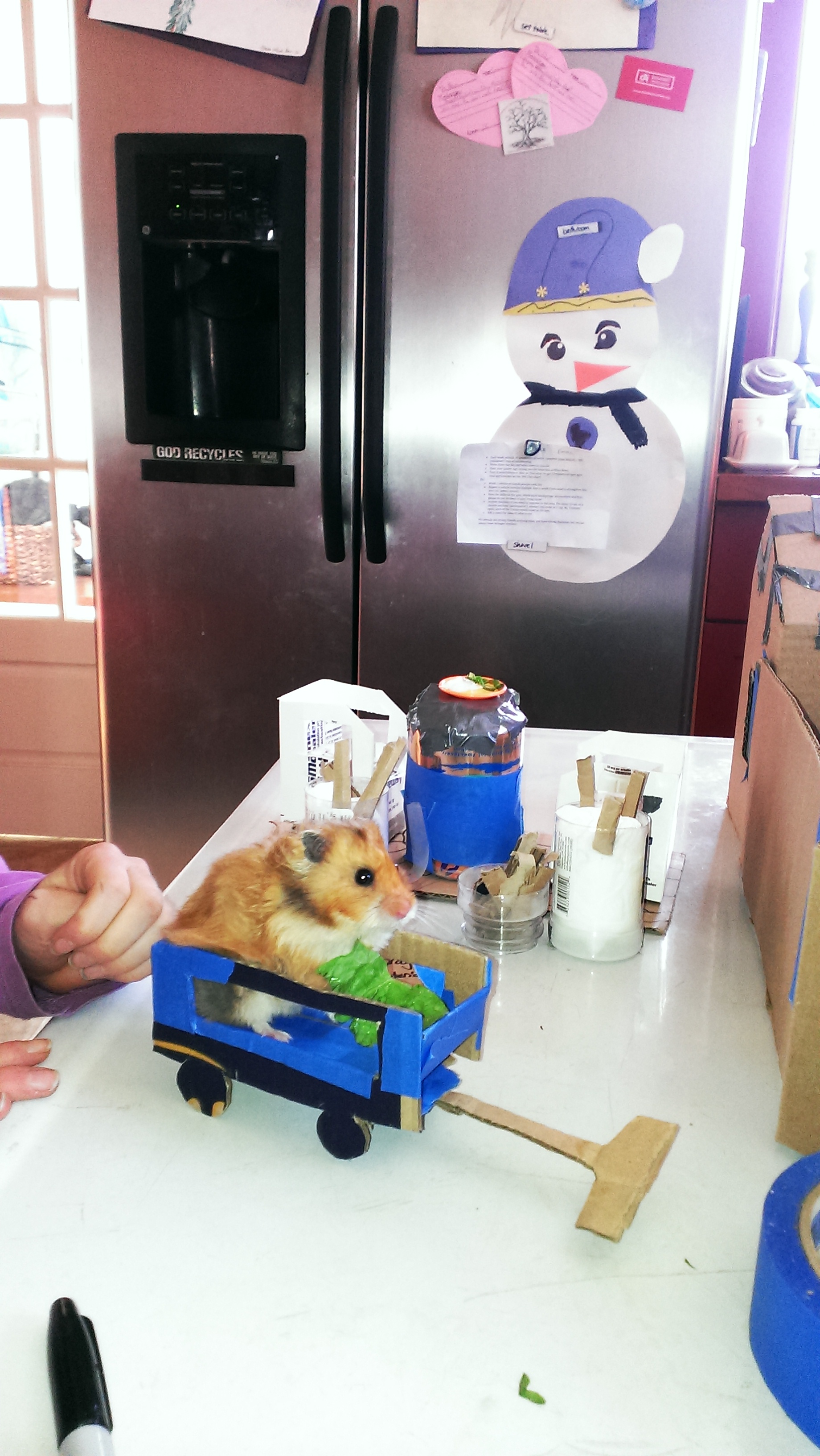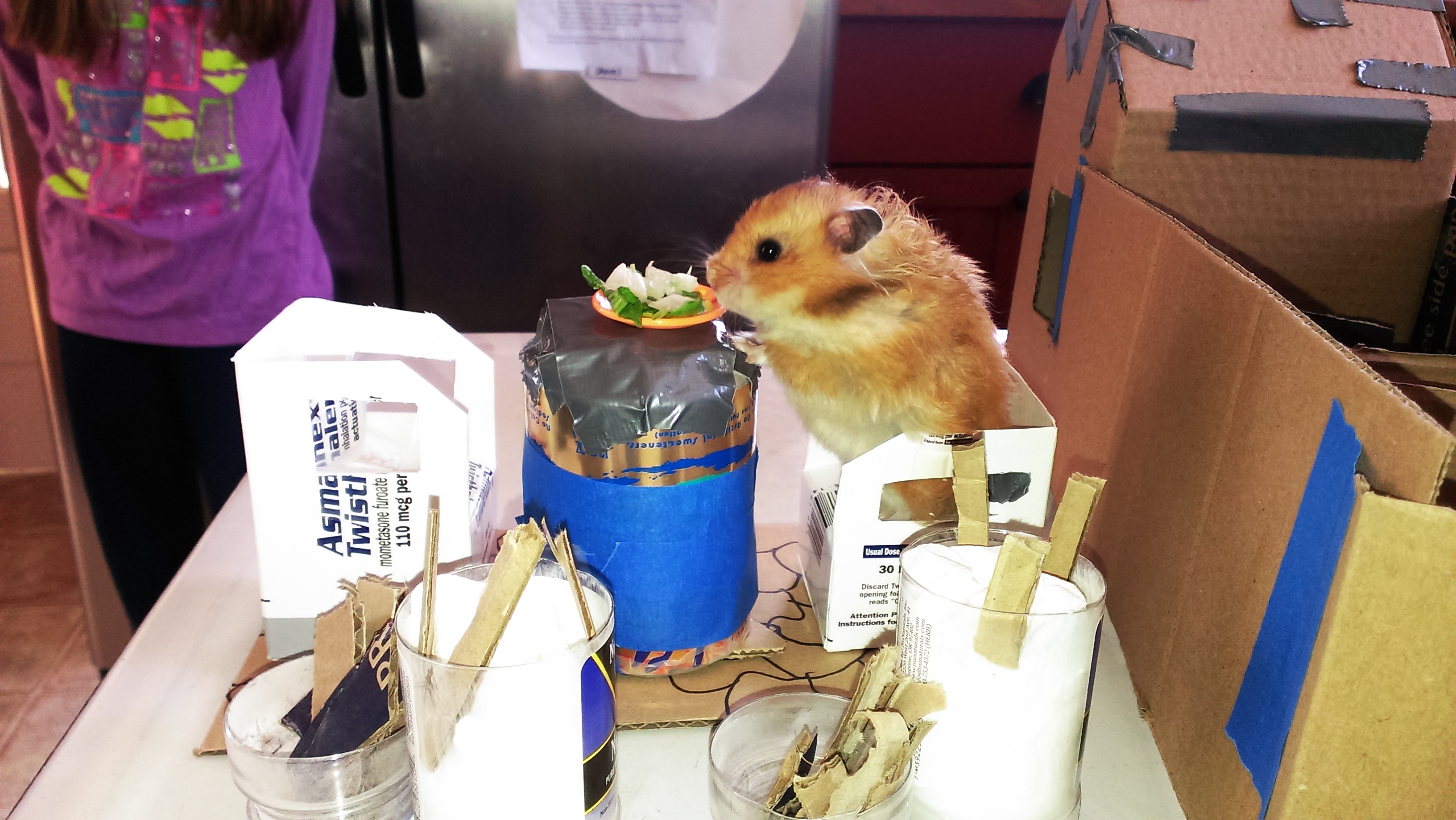 Grandma and Grandpa paid a visit recently. The wife and I left on a date for a mere hour, and returned to discover that they had ransacked the recycle bin in order to create a remarkably imaginative setting. Boxes, cans, bottles, and odd pieces of cardboard were converted into chairs, a table, a wagon to pull the creature around in, a school, church, home, etc. She had so much fun with this! One hour provided her with more joy than several years of caring for 100+ animals ever did for me. Here you can see Lucy snacking on a tiny salad….