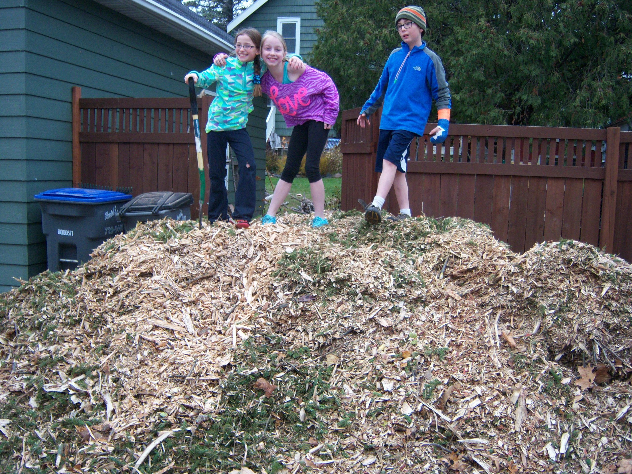 We took in between 80 and 100 bags of leaves by setting a sign out in the front yard. I’m always amazed so many people wish to part with them. Chopped, they make a wonderful mulch for the gardens, keep weeds down, and hold moisture in the soil. My kids and their friends had a great time jumping into enormous piles of them as well.