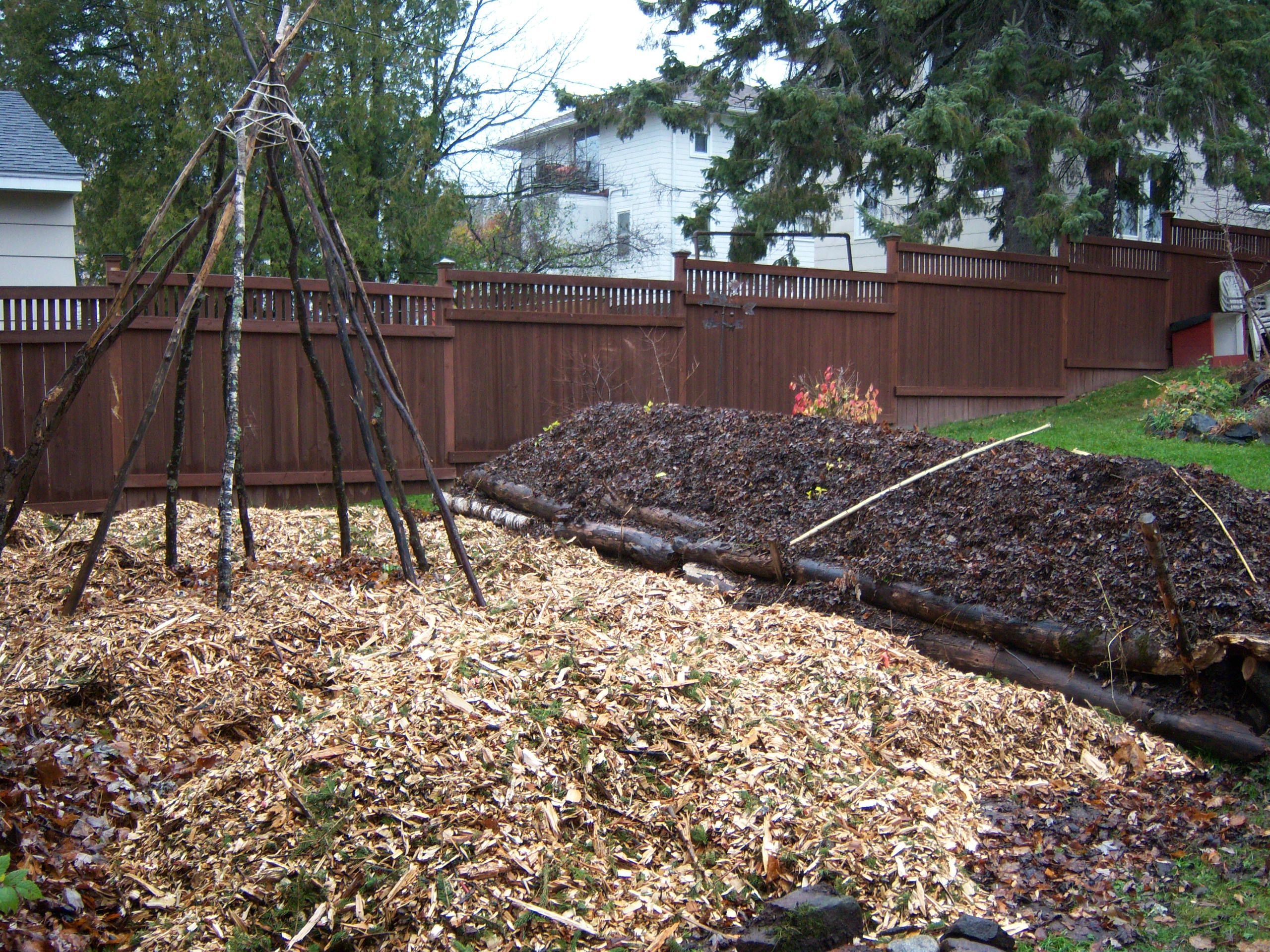 We’re using these to DEEPLY cover what otherwise would be a muddy area behind my hugel bed, and lets be honest, this is just another opportunity for me to share another picture of the beauty. The kids are going to use this spot as a play area. We mined the branches (and logs for the hugel) from a nearby wooded area. Sticks are much better playthings than useless plastic objects! Anyhow, now our kids can make a mess in this area without me nagging them to clean up all the time. Old painter drop cloths will ultimately cover the teepee: