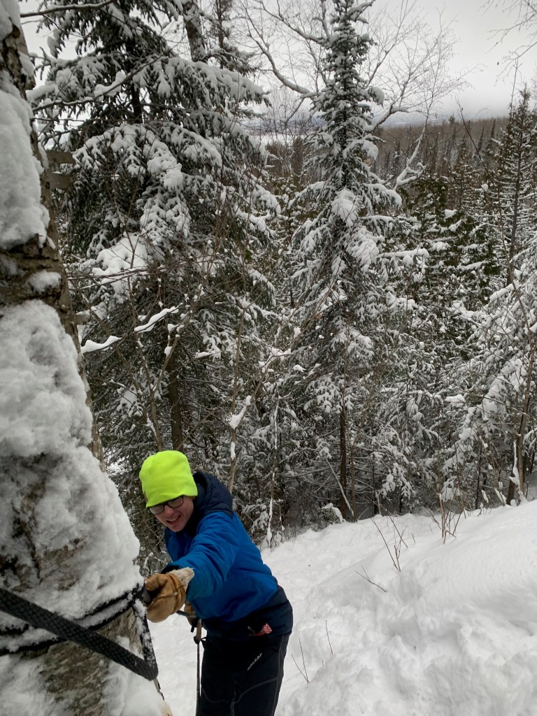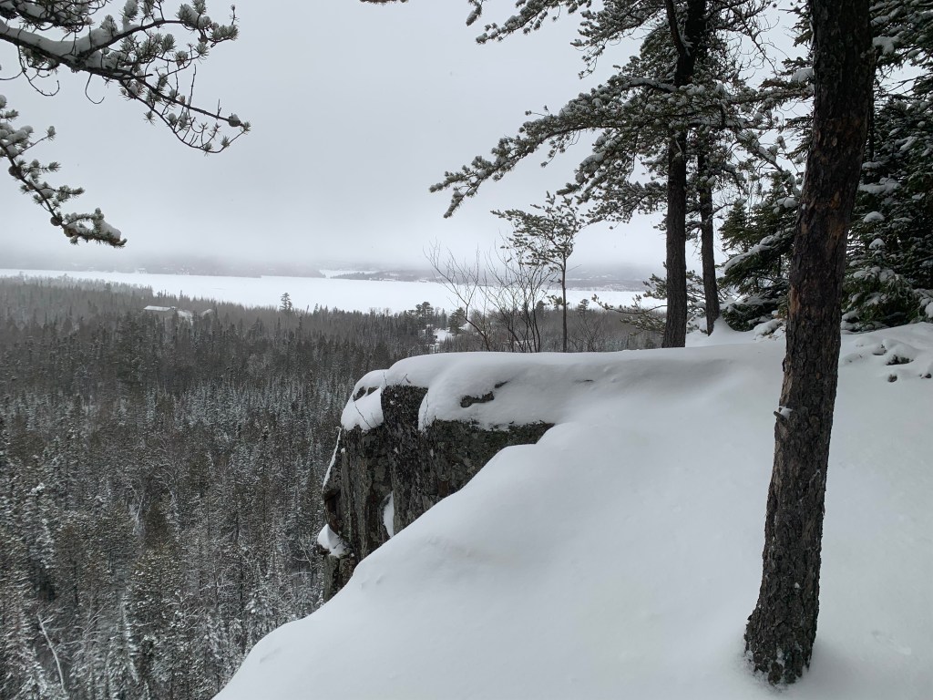 The morning we left, yesterday as I’m writing this, me and the boy snowshoed a couple miles up the hill to the ridge above Gunflint Lake.