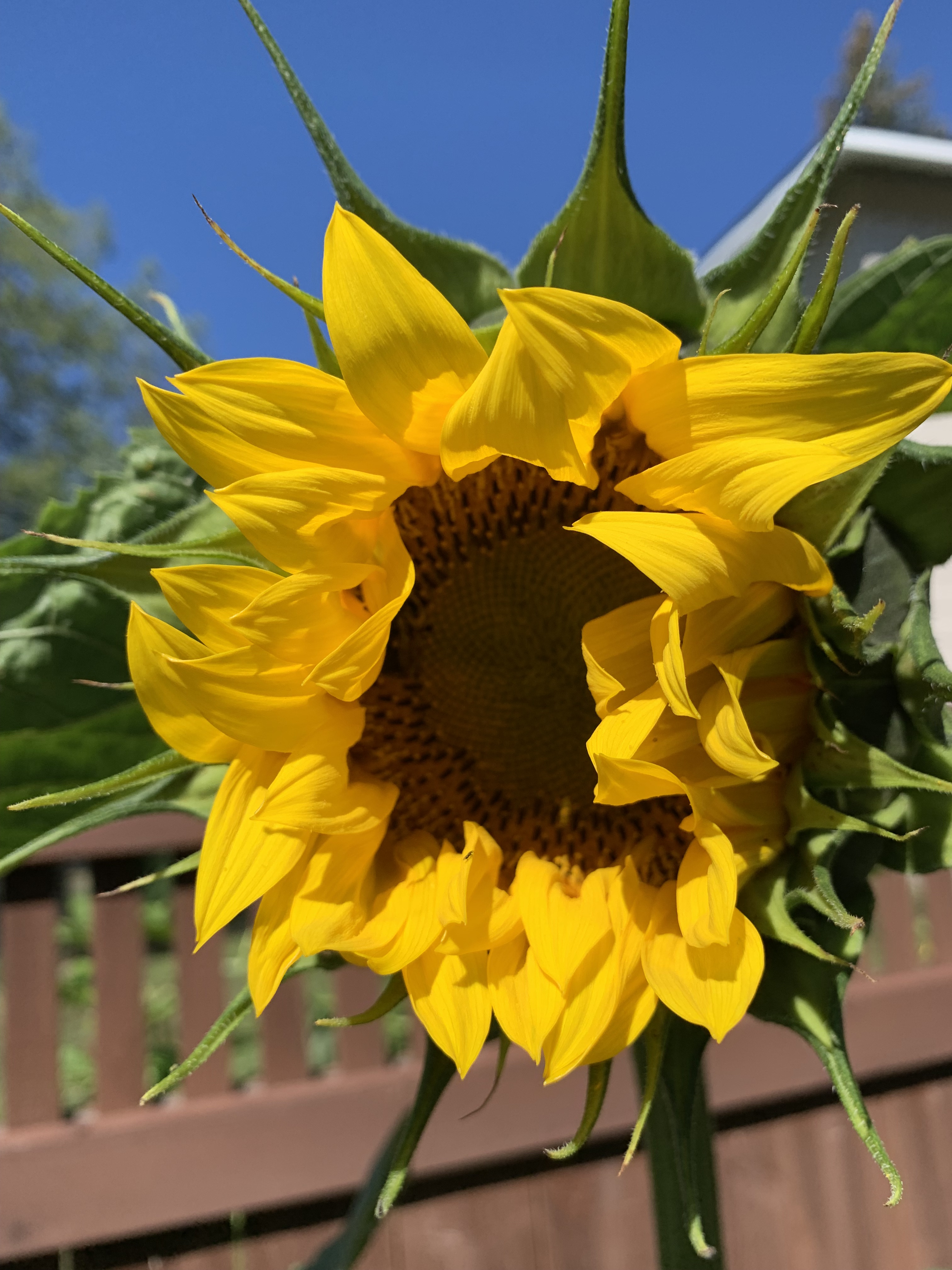 The flower faces directly east, just like the thousands of North Dakota sunflowers we drove beside on our journey home. A striking sight, each had their backs to the setting sun, just as we did, on our rapid careen homeward back East. Without a single observable straggler, it was as if a great congregation was cheering us on in our improbable quest to make the long haul in a single go. To arrive home and find this friend fixed in the same position was a true delight. The trait is hardwired into their genetic code, something only recently discerned by researchers, as apparently morning sun provides early warmth that attracts more bees (critical for reproductive success).
