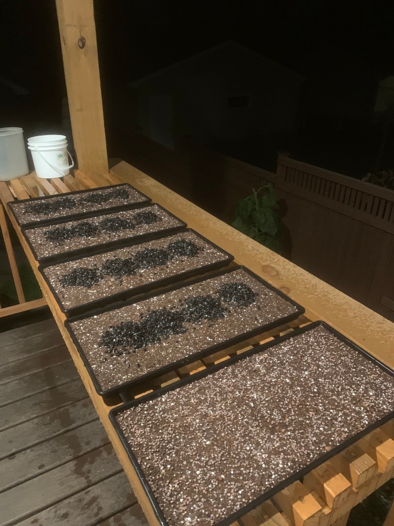 Arriving home, I still had to plant 22 trays of microgreens, but at least there were the new lights above my fancy new deck: