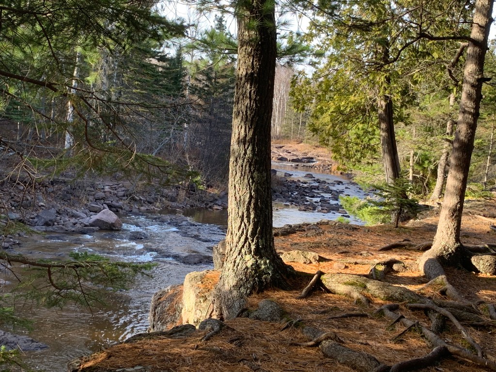 I was also looking forward to setting up shop at one of the most glorious campsites I’ve ever seen. I spied it out about 12 years ago and always hoped to return. The kids were quite young at the time, and I had taken a day off work for some solitude. Though I was only to stay for daylight hours, I packed the same massive backpack that served me on the month-long train trip described in my first book. A late fall, overcast day, rain was in the forecast. I brought a tent, sleeping bag, and about seven books. Tired of carrying my burden, I selected a mediocre campsite near the Gooseberry River surrounded by a tangle of alders. I pitched the tent, laid out the sleeping bag, took a nap, read a while, and even enjoyed a fire. Feeling light and unburdened, I ambled further up the trail and discovered a much better campsite less than a half-mile away. The last of the maple leaves were falling from mature trees, and the sound of water sifting through the nearby beaver dam was incredibly alluring. More than anything, I wanted to sit beside this beaver dam and read my book for an hour. Or two.